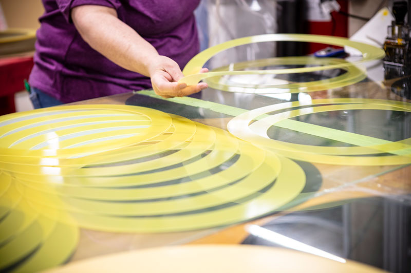 Each template is backed with a pressure-sensitive adhesive, specifically suited to withstand the effects of the polishing environment. Our templates are assembled in a clean, climate-controlled environment to limit particle contamination. All template edges are milled smooth to prevent particle introduction during the polishing process. The final product is sealed in one-load packages to keep templates clean until use.
